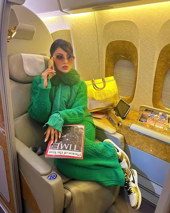 ग्रीन आउटफिट में उर्वशी रौतेला ने प्लेन में दिए विंटर लुक